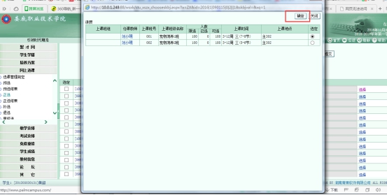4、在当前界面单击“网上选课”功能项下面的“正选”,选择“课程范围”为“主修(公共任选)”,在你选修对应的公选课后面点击“选择”,选定合适的上课时间,点击“确定”,最后“提交”。选课完成后,务必在“正选结果”里查看选课是否成功。