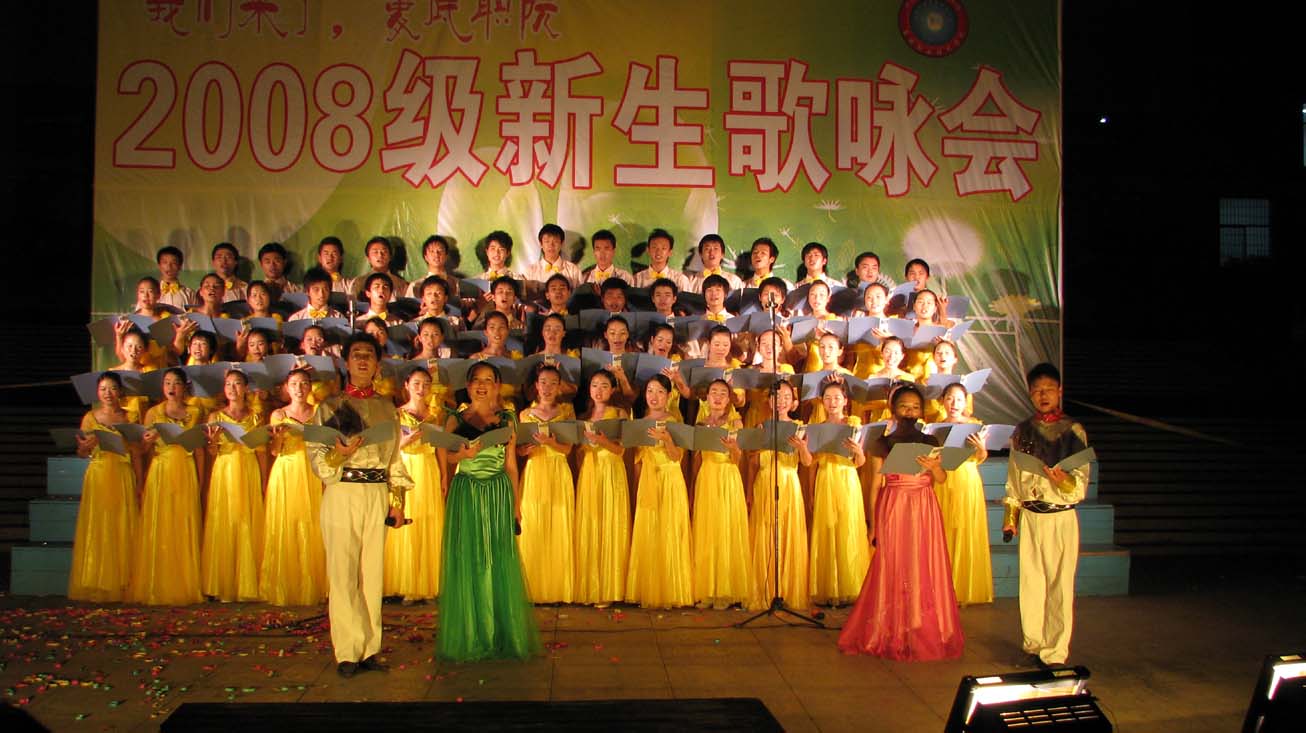为了让新同学深刻领会院训和院歌的思想张力和博大内涵,增强08级新生的归属感,构建和谐、健康、文明的校园文化氛围,9月21日晚上7:00由院团委、学工处主办的“我们来了,娄底职院”2008级新生歌咏会在文化广场举行,院领导欧友佳、龙伟、周意坚、刘自斌、邹松健、曾国基以及各处室系部负责人观摩了比赛,08级全体新生参加了比赛。