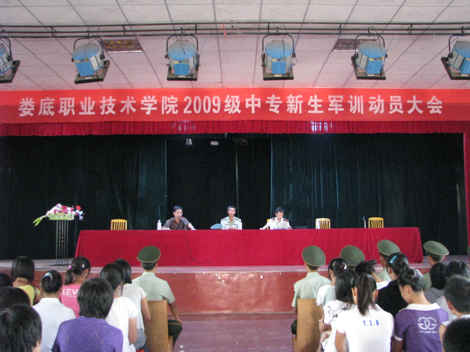 8月29日,我院2009级中专新生军训动员大会在南苑活动中心举行,学院保卫处处长龙玉林、继续教育部副主任李甄、娄底武警支队教导大队大队长孙青柏少校出席。2009级三百多中专新生及班主任参加大会。