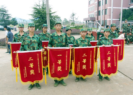 党委副书记彭建胜宣读了对06机电大一二班等9个军训优秀班级以及25个军训优秀寝室的表彰决定。院领导为军训优秀班级颁发了锦旗。
