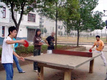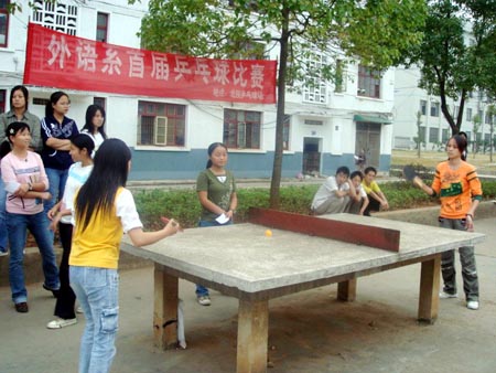 外语系于10月17号开始了首届乒乓球比赛,地点在北院图书馆前的乒乓球场。此次活动由系体育部组织开展,其它各部门协助。裁判组由系体育部成员和各班的体育委员组成。本次比赛共有52名男女选手参加。他们将以分组淘汰的方式决出半决赛选手。到底哪些“乒”坛高手能进下一轮的争夺,让我们拭目以待吧!(文/许望正 图/谭妙琼 )
