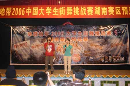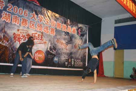 最后我院街舞协会代表队不负众望,拿到HipHop组第一名的好成绩,并顺利晋级11月4日在湖南师范大学举办的复赛。他们向其它高校的同学展示了我院大学生活泼、健康、积极进取的精神面貌,让大家看到了我院大学生不仅懂技术,也懂艺术!(05级模大五班 周爽 )