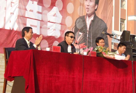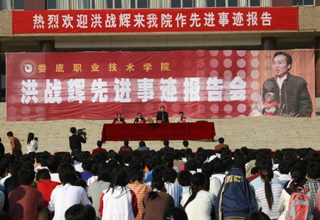 洪战辉于2003年考上怀化学院读大专,今年7月以优异成绩考上了中南大学工商管理专业的本硕连读。他先后被评为“湖南省优秀大学生”、“湖南省首届大学生品学奖”获得者、全国自立自强优秀大学生、2005年“感动中国”十大人物之一。与他同时到来的中南大学学生工作部长喻跃龙教授对学院高度重视并精心安排此次报告会表示感谢,他说,中南大学党委对洪战辉同学作了一个精辟的评价:是广大青年学子中的一颗优秀种子,经世致用、百折不挠、知行合一、敢为人先的湖湘文化和中原文化的深厚土壤以及兼容并蓄、与时俱进的湖南高等教育的光合作用共同培养和磨砺了洪战辉的优秀品质和坚强意志,使他历经风雨,茁壮成长。他带给人们的宝贵精神财富是身处逆境、坚忍不拔的顽强毅力;自立自尊、自强不息的崇高精神;永不放弃,永不认输的达观精神;勇于进取、艰苦创业的实践精神和关爱家庭、回报社会的强烈责任感。