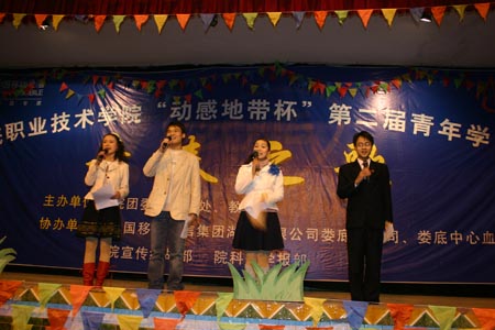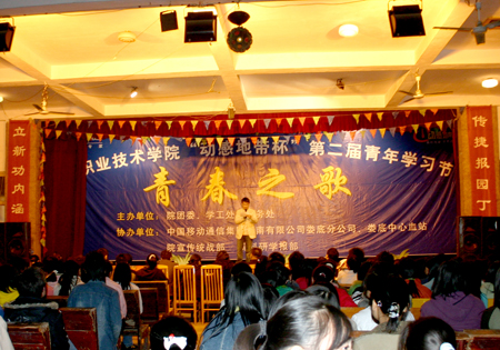 12月2日晚,第二届青年学习节“青春之歌”校园飚歌大赛在我院礼堂落下帷幕。20名由各系部选拔出来的选手们在这里一展歌喉,争夺本次大赛的桂冠。体育艺术系与学工处、团委的教师担当本次大赛评委。选手们身着节日的盛装,载歌载舞,用精湛的歌艺和落落大方的台风获得了在场观众的热烈欢迎。经过一番比拼,机电工程系熊少华和财经贸易系盛斌获得一等奖,计算机系滕琳等3人获得二等奖;三等奖由机电工程系张一波等6人获得。