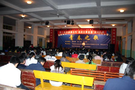 12月8日晚,第二届青年学习节系列活动之“我的大学生活”演讲比赛在学院礼堂隆重举行,来自全院各个系部的17名学生选手围绕此主题展开声情并茂的演讲。经过2个小时的激烈角逐,李香莉、张萍荣获一等奖,刘金艳等同学获得二等奖,张青燕等同学获得三等奖。本次活动由公共事务管理系承办,湘鹰演讲团协办。(实习记者 陈明娟 图/伍建湘)