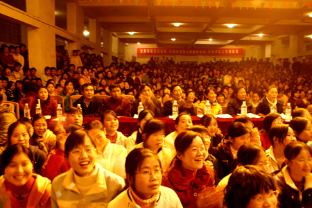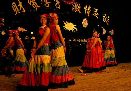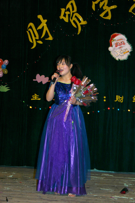 一场活泼、热辣的开场舞《向前冲》拉开了整场晚会的序幕。晚会共有10个节目,其中亮点多多,节目中穿插了不少游戏,学工主任张一军上台与同学们一起玩起了高难度的“弯腰过绳”游戏;财贸系学子的必修课“点钞”也被作为一个游戏环节搬上舞台,当一位学生以不逊于点钞机的速度点钞时,全场喝彩声、掌声久久不息,体现了“寓教于乐”的要求。同时,两位可爱的圣诞老人时不时从后台走到观众席抛洒糖果,引得台下阵阵尖叫和欢呼。也为晚会增添了圣诞的气息。