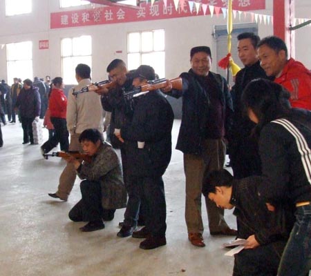 看,猜谜语比赛中,大家时而冥思苦想,时而争先恐后地在红绿色的谜语纸上打勾划圈,表示这道题的答案我知道;套圈、掷乒乓球、击门球、投篮球、掷飞镖、射气球都要求参赛者既有手劲又有眼力,参赛者们一个个地憋足了劲儿,打中的兴高采烈,没有中的一边不服气一边摩拳擦掌再打一次;瞎子击锣更是引起了大家的阵阵欢笑,将全场的游艺活动推向了高潮。