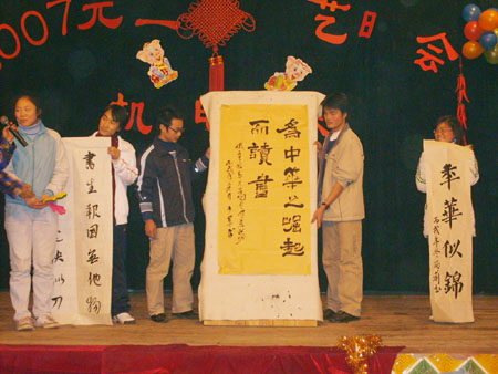 最后,身着白色服装的我系学生会成员高举蜡烛,演唱了一首《让全世界充满爱》,至此,我系2007年元旦文艺晚会也告一段落。经过近三个小时的演出,晚会在歌声中拉下了序幕。