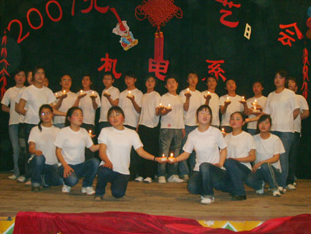 2006年12月30日晚上7点,由机电工程系主办,机电工程系学生会承办的 “2007年元旦文艺晚会”在我院南院大礼堂浓重上演。作为机电工程系年度压轴大戏,这台由系学工处、学生会精心策划的晚会充满了时代与青春的气息。晚会的节目分别由我系各个班级选送和系学生会组编,整台晚会共分为“同乐”、“爱”、“喜”三个篇章。