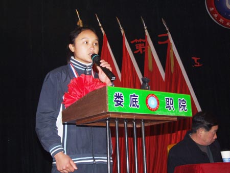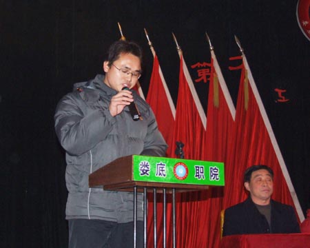 院长刘演林在会上发表讲话。他说,在省第八届大运会中,我院体育代表团取得了运动成绩和精神文明的双丰收,充分展示了娄职学子的精神风貌、意志品质和运动水平,必将有利推动我院体育工作和人才培养工作向更高水平迈进。刘演林指出,要真正使我院的体育教学成为培养高素质技能型人才的基础性工作,我们一要大力加强体育教师的综合素质培养,树立良好教风和师德;二是加大体育教学改革的力度;三是大力开展群众性体育活动,增强学生体质和健康;四是要进一步改善体育教学的训练设施和条件;五是希望同学们积极投身体育锻炼中,为自己的职业生涯打下一个良好的身体与意志基础。