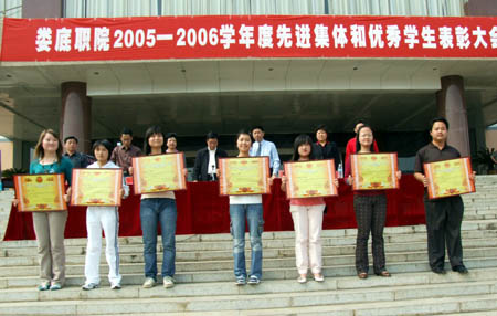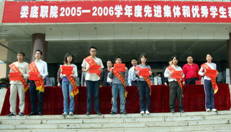4月16日下午,我院在主教学楼前坪隆重举行2005-2006学年度先进集体和优秀学生表彰大会。院领导刘演林、彭建胜、周新元、宁小玲、颜彩飞、龙伟、朱建国等出席并为获奖者颁奖。各部门负责人、大专班师生参加了大会。