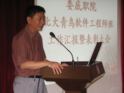 院长刘演林在会上发表讲话。北大青鸟公司执行副总裁刘金华做工作汇报, 项目经理聂江尧,员工吴恒做代表发言,探讨了将公司管理模式引入班级管理中的做法与感受。(计算机系)