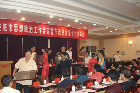 7月12日上午,全市思想政治工作会议暨市政研会第十三次年会在鸿兴宾馆举行。市委常委、宣传部长童名让、市委巡视员赵协卿、副市长邓建和以及市直有关单位负责人、宣传部长参加会议。我院政研会被评为2004-2006年度全市优秀政研会,党委副书记彭建胜的论文《论高职院校校园文化的可持续发展》被评为优秀政研成果二等奖,宣传统战部部长王宗凡被娄底市委授予优秀思想政治工作者荣誉称号。同时,彭建胜当选为娄底市政研会第八届理事会常务理事。(宣传部)