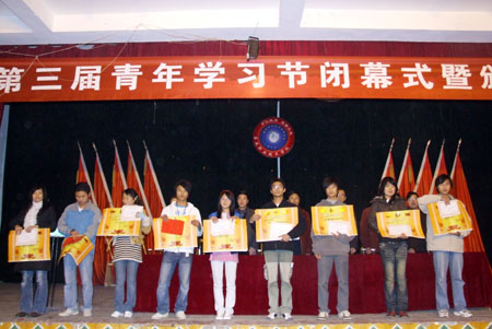 杨惠梅宣读了吴铃、戴艳飞、阳小朋等“十佳”学习标兵、学习型宿舍以及第三届青年学习节期间各项赛事的学生集体和个人获奖名单。第三届青年学习节先后共有1500多名学生参加了创业计划设计竞赛、“十佳”学习标兵评选、“感恩的心”征文比赛、演讲比赛、校园歌手大赛等18个大项的比赛,评选出了68个奖项,共有254个集体和个人获奖。