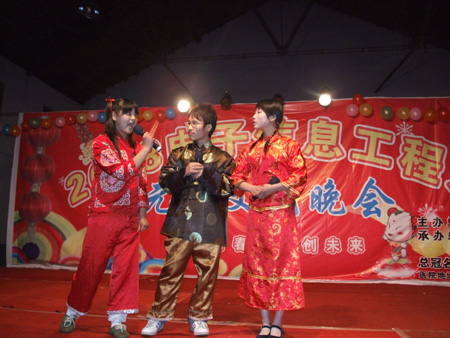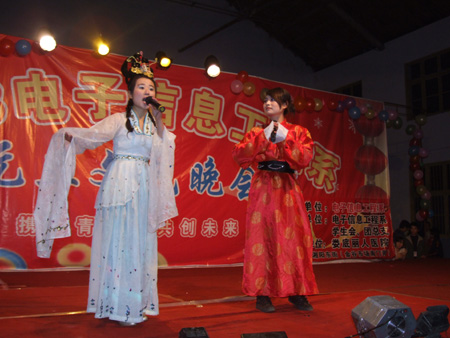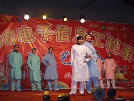 12月26日晚7:00,娄底职院室内篮球场歌声飞扬,舞姿曼妙,成为欢乐的海洋,由电子信息工程系主办的“2008年元旦文艺晚会”在这里隆重举行。出席此次晚会的领导有副院长龙伟、工会主席刘自斌、学工处处长刘罗仁、院团委书记杨惠梅、教务处处长易爱良、电子信息工程系主任吴连贵、系总支书记唐毅慈、副主任申东亮,电子信息工程全系系师生观看了演出。