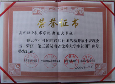 同时,在共青团湖南省委、省委教育工委、省教育厅、省学生联合会共同开展的第三届湖南省优秀大学生社团评选活动中,我院文学社团新星文学社由于在促进校园文化建设、拓展学生素质等方面表现突出,被评为湖南省优秀大学生社团。上述荣誉的取得,标志着我院学生工作逐步迈上了一个更高的发展平台。(学生记者 杨正强 曾春桃)