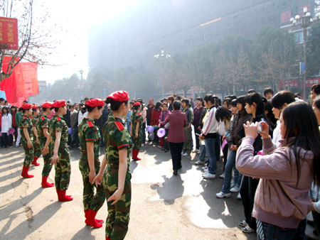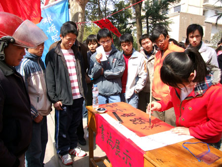 在3月1日的活动中,我院青年志愿者以系为单位开展学雷锋活动,有的挥毫泼墨,为围观的群众书写对联,有的在向路人发放“科普知识”传单;有的在献血车前排队献血,有的在清扫街道、维修家电。在“学习雷锋我写我颂”活动中,各系部还表演了舞蹈、唱歌、演讲等文艺节目,吸引了不少市民驻足观看。