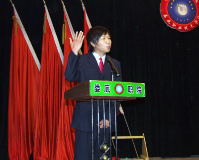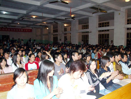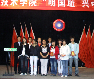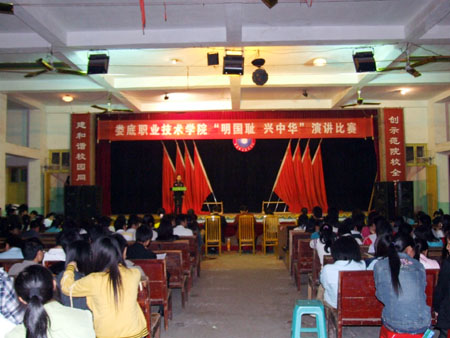 3月28日晚,由思政课部主办,院团委协办的“明国耻、兴中华”演讲比赛在我院礼堂举行。副院长龙伟、院宣传统战部部长王宗凡、院团委书记杨惠梅、思政课部主任周旺东、建筑与艺术设计系主任夏高彦、思政课部马列主义教研室主任朱君,以及07级学生代表近800人,观摩了此次演讲比赛。