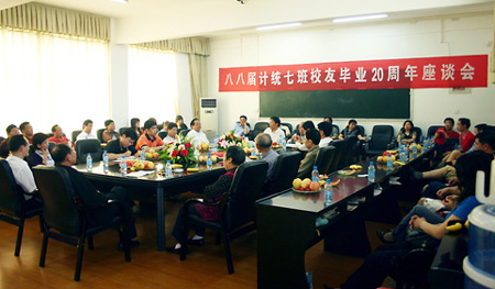 5月2日上午9:00,由财经贸易系承办的八八届计统七班(原娄底经济贸易学校)校友毕业20周年座谈会在我院实训楼207室隆重举行。院党委书记陈立楚、院党委副书记彭建胜、院工会主席刘自斌、原经贸学校副校长邹友松、院工会副主席伍翼程(班主任)、财贸系主任周志和、学工主任张一军以及部分任课老师参加了座谈会。