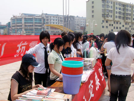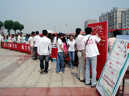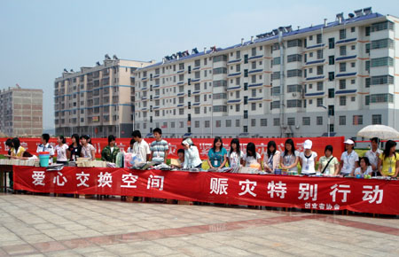 5月18日――20日,我院创业者协会在文化广场举行以“爱心换空间――赈灾特别行动”的义卖活动,他们将自己省下来的零用钱集中起来批发来各类电子商品、生活用品、学习用品进行义卖,义卖中所赚到的钱将全部捐给灾区人民。