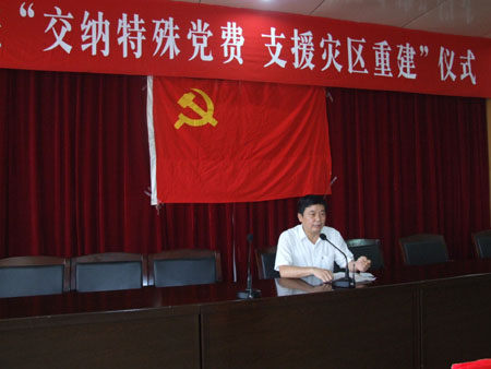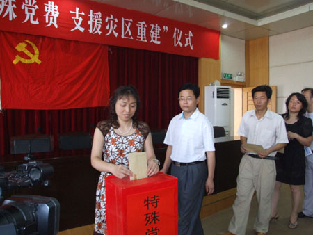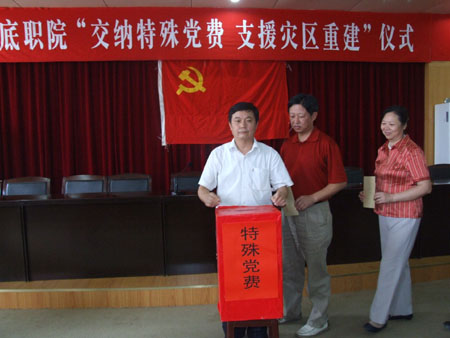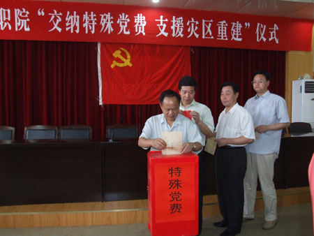 仪式在雄壮的《国际歌》中正式开始。院党委书记陈立楚发表讲话,指出在中国共产党成立87周年前夕,我院共产党员聚集在这里交纳“特殊党费”,意义重大。这不仅是向灾区人民奉献一份特殊的爱心,更是对全体党员进行一次党性教育,是向党奉献特殊衷心。5月12日汶川发生特大地震,损失重大,现在正在进行灾后重建工作。我们每个共产党员都要增强党员意识、责任意识、先锋队意识,在继续关注灾区建设与发展的同时,更要立足岗位,做好本职工作,以实际行动支援灾区建设。现在学院发展进入关键时期,我们党员要发挥先锋模范作用、表率作用,要起示范带头作用,平时要看得出来,人民需要时要站得出来,危急关头要豁得出去,遇到艰难险阻时要冲得上去,为学院的改革发展和稳定做出贡献。