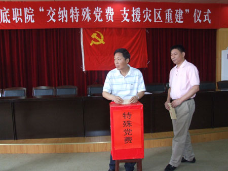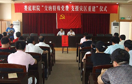 6月27日上午,我院在主教学楼报告厅举行“交纳特殊党费 支援灾区重建”仪式。全体院领导、全院党员同志共200多人出席仪式,仪式由院党委副书记彭建胜主持。