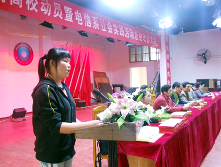 电信系学工主任申东亮在会上就电信系08暑假学生社会实践活动作了总结。教学主任游新娥宣读了社会实践活动获奖名单,表彰了电信系08暑假学生社会实践活动07电子1班、07动大2班、07工艺班等六个先进班级以及07电子1班赵茜丽、王维、肖升阶等49名学生先进个人。