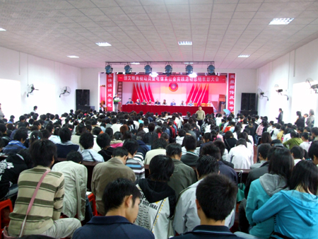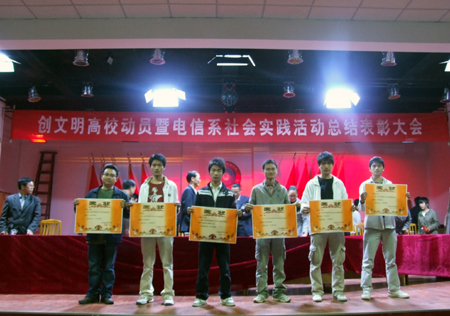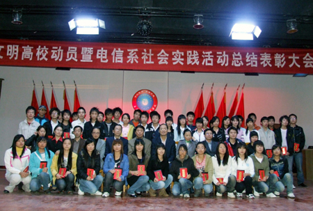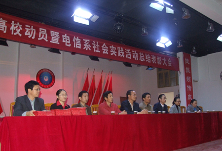 11月1日,我院电子信息工程系在南苑礼堂举行了“创文明高校动员暨电信系社会实践活动总结表彰大会”。院党委书记陈立楚、副院长龙伟、教务处处长易爱良、院学生工作处处长刘罗仁、院团委书记杨惠梅、电信系主任吴莲贵、电信系党总支书记唐毅慈、教学主任游新娥、学工主任申东亮出席了会议,并为获奖班级和个人颁奖。电子信息工程07、08级以及06级部分学生共1300余人参加了表彰大会。吴莲贵主持了大会。