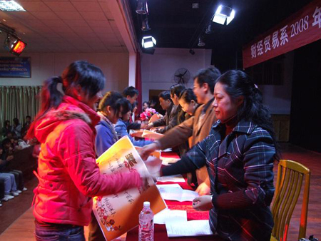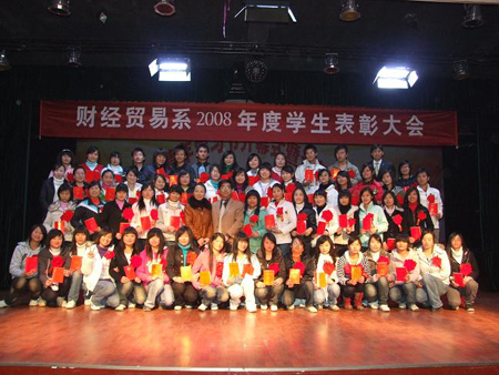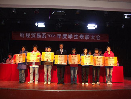 财经贸易系2008年度学生表彰大会于12月7日晚8点在南苑学生活动中心成功举行,全系师生1000余人参加。出席大会的领导有学院党委书记陈立楚、党委委员、副院长龙伟、党委委员、工会主席刘自斌、学工处处长刘罗仁、团委书记杨惠梅和财经贸易系主任周志和、总支书记朱岳坤、教学主任朱阳生、学工主任张一军及各专业带头人。