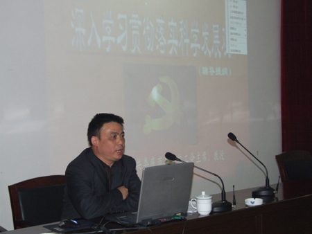 谭均云教授提纲挈领地讲解了科学发展观产生的历史背景、科学发展观的内涵、为什么要学习科学发展观、怎样落实科学发展观四个问题。谭均云指出,以人为本、全面协调可持续发展的科学发展观,是我们党从新世纪新阶段党和国家事业发展全局出发提出的重大战略思想,是我们推动经济社会发展、加快推进社会主义现代化必须长期坚持的重要指导思想。是在立足我国的基本国情、总结了我国的发展实践、借鉴了国外发展经验、适应了发展新要求的特定的历史背景下提出的,具有阶段性、与时俱进、历史性的时代特点。