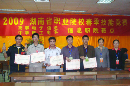 湖南省教育厅主办、湖南省教育科学研究院职业教育与成人教育研究所协办的“2009年湖南省职业院校春季技能大赛”于2009年4月25-27日于在长沙举行,我院电信系组织三名学生申琼良(07应用电子大二班)、张科军(07应用电子大二班)、吴文超(07机电一体化一班)参加了湖南信息职院赛点高职电子信息专业电子产品设计及制作项目的大赛。