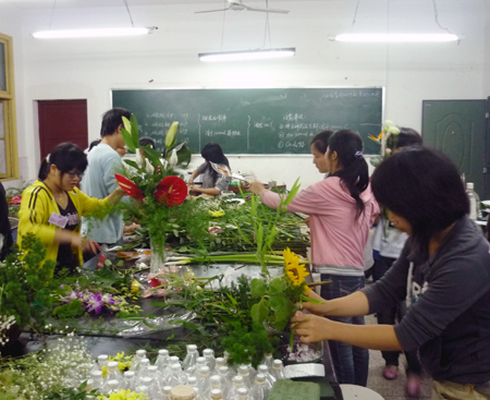 为了丰富学同学们的课余生活,培养学生科学思维能力、提高艺术鉴赏能力,5月25日,由院团委和花卉协会主办的以“和谐校园”为主题的插花艺术比赛在科技楼401举行。农林工程系的专业老师曾玉华、邓工农、胡松梅现场观摩比赛并对参赛作品进行了点评。
