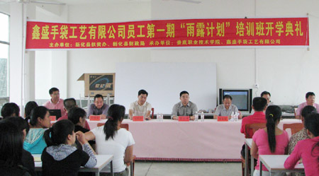 7月29日上午,由我院和鑫盛手袋工艺有限公司共同承办,新化县扶贫办、财政局主办的鑫盛手袋工艺有限公司员工第一期“雨露计划”培训班开学典礼在新化县曹家镇水竹村隆重举行。我院党委委员、副院长周意坚,新化县人民政府副县长李文峰,新化县扶贫办主任方东升,新化县财政局党组书记彭萼其,学院继续教育部主任朱存斋及鑫盛公司副总经理邓仕东等有关方面负责人出席典礼,典礼由朱存斋主任主持。