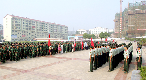 旭日东升,迷彩熠熠,9月6日,我院2009级大专新生军训动员大会隆重举行。副院长刘自斌、保卫处处长龙玉林、学工处处长刘罗仁、院团委书记杨惠梅及武警娄底支队相关领导出席,大会由龙玉林主持。刘自斌作军训动员报告,以“青年兴则国家兴,青年强则国家强”勉励09级新生,增强国防观念,掌握基本军事技能,将军训做为成才的重要开端。
