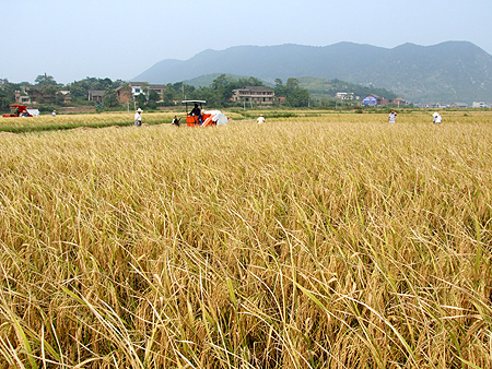刚到小碧乡,就见一片片金黄的稻穗迎风飘扬,五六台收割机在稻田中忙碌穿梭,当地农民与收割机操作员顶着烈日汗流浃背地收割着水稻,一派热火朝天的工作景象。杜祥培、龙伟等院领导下到田间生产现场,亲自对收割机作业状况进行详细考察。考察中杜祥培、龙伟等对4LZ-0.8型收割机作业质量给予了高度评价,并对其工作效率赞不绝口。据了解,每逢收割季,往常农民们都采用手工收割,每人每天不足0.5亩,而启用新型收割机作业后,1小时就能收割两到三亩水稻。杜祥培不住感叹农机产业大有发展前途。整整一个上午,我院领导深入田间、工厂,对收割机的工作过程及生产现状进行了全面了解,并表现出浓厚兴趣。