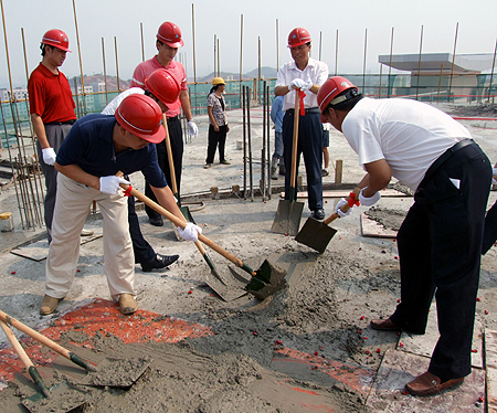 随后,我院领导与嘉宾一起挥动铁铲,为综合楼浇上了最后一捧水泥砂浆。至此,综合楼封顶仪式顺利结束。据悉,综合楼竣工后,将集学术报告厅、培训教室、会议室、办公室等于一体,预计今年年底正式投付使用。(李莉)