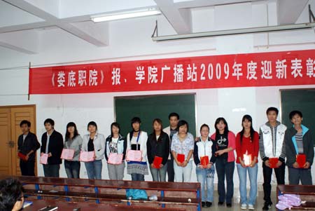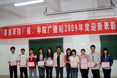张亮、车颖宣读了广播站、院报2009年新成员名单。刘艳老师在发言中肯定了过去一年里,院报学生记者和广播站全体工作人员为学院宣传工作所做的努力和贡献,并对新加入的成员表示诚挚欢迎,希望新老成员要共同具备“我是娄职新闻工作者“的意识,服务学院,服务师生、服务娄职。之后,她宣读了08至09年度院报和广播站优秀成员名单,王宗凡部长与刘艳老师共同为获奖人员颁奖并合影。