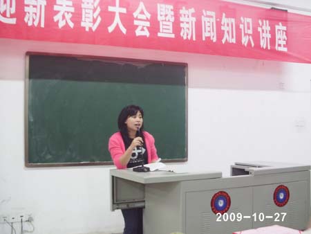 10月27号晚,《娄底职院》报、院广播站2009年度迎新表彰大会暨新闻知识讲座于主教学楼110室隆重举行,院宣传统战部部长王宗凡、院报责任编辑刘艳、《娄底日报》总编室主任肖思林、院报全体学生记者和院广播站全体成员、学院新闻爱好者近200人参加了此次活动。本次活动由院宣传统战部主办,由院广播站站长张亮、院报记者站站长车颖共同主持。