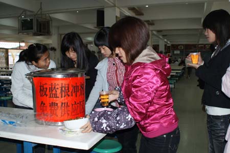会议召开后,后勤部门马上安排部署具体工作:分派专人联系采买板蓝根等中成药,根据医务室报送的药剂单采购治疗用药;后勤服务中心组织购进大批84消毒液,组织人员在学生宿舍、教室、公共场所喷洒,将教学楼、实验楼、办公楼等场所的教室、卫生间、走廊、楼梯扶手进行了全面彻底的消毒。中午,我们看到食堂已经摆出了板蓝根冲剂茶桶和一次性塑料杯,向学生们免费供应。