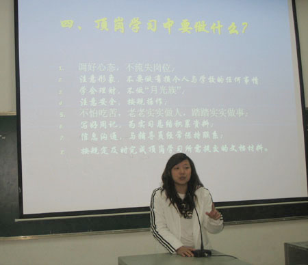 会上,吴莲贵从系部目前就业情况、就业进度以及用人单位等方面提出2010届毕业生应对就业难形势的策略。她指出我们毕业生应调整自身心态,加强职业素质的培养,提高自身能力,淡化专业观念,抓住各种机会,积极推介自己,在明确自己职业目标的同时,也要有备选目标,要做好两手准备。吴主任的报告对就业形势分析透彻,对就业难原因的分析深入具体,关于就业难的应对策略也实用有效,增强了同学们对就业形势的认识,有利于同学们发挥自身优势,提高就业能力,受到了广大同学的热烈欢迎。吴主任指导毕业生应从学业准备、材料准备、信息收集准备、模拟训练、招聘会、笔试与面试、签约七大方面来提高自我竞争力。艾长春告诫毕业生们必须改变就业理念,易瑜则以自身经历向毕业生们传授求职技巧。