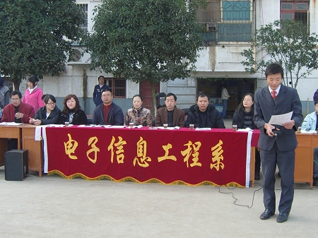 为培养学生的团队意识和集体荣誉感,提高全系的广播操水平,展现电信系青春靓丽的精神风貌,2009年12月5日电信系在北院篮球场举行了08、09级广播操比赛。此次比赛得到了系领导的高度重视和大力支持,系主任吴莲贵、党总支书记唐毅慈、学生科科长江国元、资助中心主任罗丽萍、学工干事赵飞以及各班辅导员亲临现场。