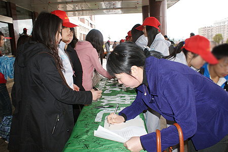 3月23日中午,主教学楼前异常热闹。两条8米长的绿色长幅摆在十几张长桌上,50余名身穿灰白色运动套装、头戴红色帽子的志愿者在桌后一字排开,热情地向下课后走出教室的学生们发放自制的资料,宣传低碳生活。同学们纷纷在印有“低碳引领环保、时尚、品质生活”、“低碳生活,从我做起”宣传标语的长幅上签名,还有同学在留言本上写下自己的感想:“低碳生活,呵护地球,很有意义”、“从小事做起,从身边做起,营造美好家园”等等。老师们也纷纷签名,表示对活动的支持。