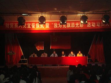 财贸系新党员入党宣誓仪式暨“我为党旗添光彩”活动动员大会于4月1日晚7:30在南苑礼堂隆重举行。出席此次大会的领导有系主任周志和、党总支书记朱岳坤、学院组织人事处组织科长封权初、学工副主任张一军以及财贸系党总支支委会全体成员,参加此次活动的有财贸系全体学生党员、入党积极分子、09级全体学生。大会由系主任周志和主持。