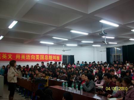 4月1日晚上7点,外语系口语协会别开生面的动员大会在主教学楼110#举行,同时诚邀“狂人英语”演讲团作超级演讲。外语系全体师生及口语协会成员参加。英语爱好者也闻声赶来,教室内人头攒动,演讲现场气氛尤为火爆。