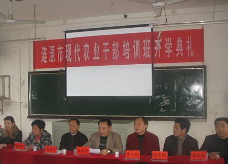 开学典礼由朱存斋主任主持,李九如主任首先代表承办单位致辞,并阐述了本次培训班的培训方案。涟源农业局副局长刘沙玲强调了实施农业干部培训的重要性,要求学员们珍惜培训机会,通过培训,增长知识,提高素质,掌握新本领,适应新形势。陈正尧同志代表学员衷心感谢单位、主办单位为大家提供本次机会,决心安心学习,不负期望。学院副院长周意坚代表学院提出了培训要求,殷切希望学员用“四心”(决心、信心、安心、静心)态度,学好现代农业知识。