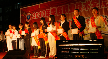 6日晚7点30分,由院团委、学工处举办的五四颁奖晚会在文化广场隆重开幕,表彰颁奖大会由党委副书记欧友佳主持。副院长刘自斌宣读了09年度院长助学金、院先进班级、优秀学生干部、三好学生、五四红旗团支部、优秀团干、优秀团员、暑假三下乡先进团队、自强之星获得者名单,院领导杜祥培、龙伟、周意坚、刘自斌、袁其谦为获奖班级和个人颁奖。