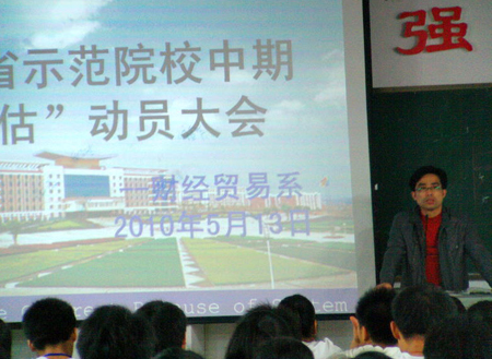 为贯彻落实学院迎接“省级示范院校年度检查”的相关会议精神,5月13日,财贸系先后召开了辅导员、全系教职工、全系学生代表动员大会。杜祥培院长亲临指导,系领导朱岳坤、朱阳生、张一军分别对迎检工作全面精心安排部署,确保万无一失。