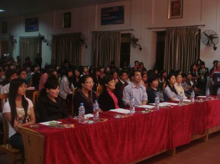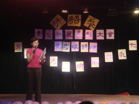 外语系主任刘燕为晚会致辞,总结了该系2010年上期学生活动取得的成绩,并宣布了英语辩论赛、寝室设计大赛、主题班会评比活动的获奖名单。领导和老师为获奖集体及个人颁了奖。