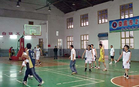 6月12日下午5点半,院领导篮球队与娄底三星集团干部篮球队的友谊赛在风雨操场开哨。院领导杜祥培、刘自斌、袁其谦、邹松建、曾国基、李天仁身着整齐的蓝白色球服,轮换上场与三星集团篮球队展开“厮杀”。