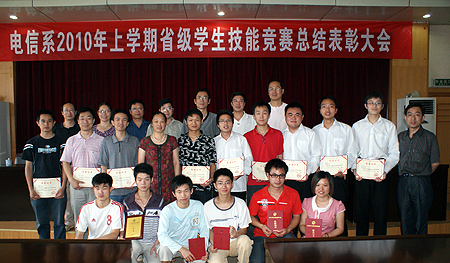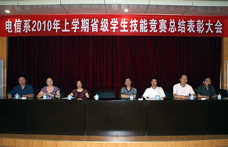 6月18日,电信系召开2010年上学期省级学生技能竞赛总结表彰大会。副院长龙伟、刘自斌,教务处处长易爱良,电信系主任吴连贵、系总支书记唐毅慈、副主任游新娥、申东亮及该系全体教师参加。会议由唐毅慈主持。